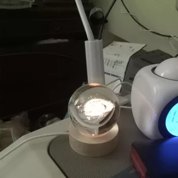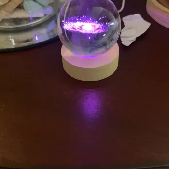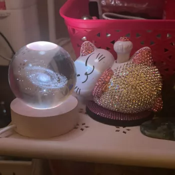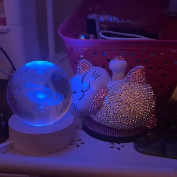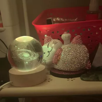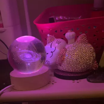 This is so cute😍 I placed it infront of my fortune cat so that it seems like she's enjoying looking at it lol😄 I love how the color changes into different hues. This crystal ball lamp is small but packs a lot of punch in adding oomph factor in your display area.💜