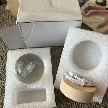 pretty much exactly how it is in the picture! the LED base works perfectly fine as well! Admittedly its a bit smaller then I imagined, the ball only fits in the palm of my hand, but honestly that's ok, its lovely either way.