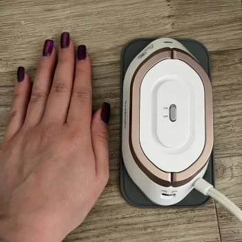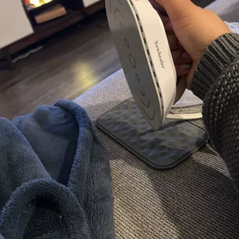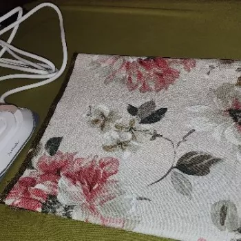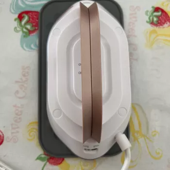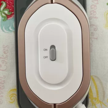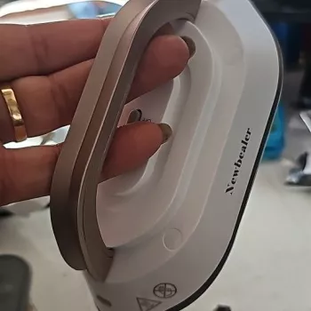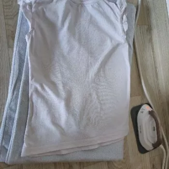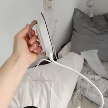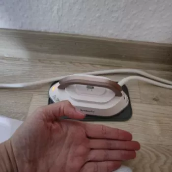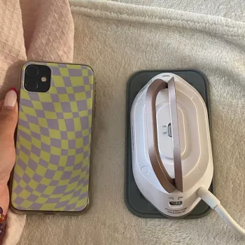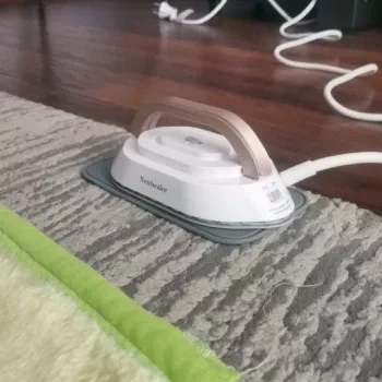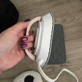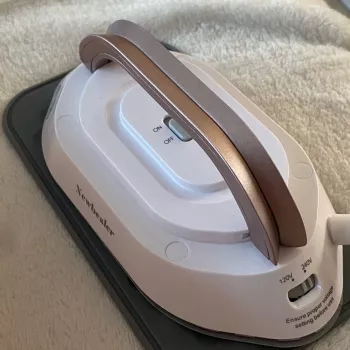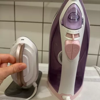 Size comparison above ⬆️! This thing is really good and gets suuuuper hot you actually have to be careful! A bit heavier than expected, but it does the job fairly nice. Obviously it will take longer to iron a whole load of laundry, so if you’re looking for a proper iron, just buy a normal size one. But this thing is great for dorm students, holidays & quick ironing if you just wanna get rid of some wrinkles! You can see a before and after pic of the exact same location once I ironed over the area. As you can see it did a good job! You should get it!! Tip 🌟 Pull up the handles once you plug it in to heat it up, otherwise the handles get quite hot as well 🥲🥲